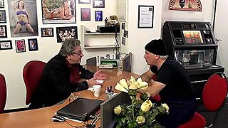 Dirty minded, German granny is sucking a younger guy's dick while still at work and getting fucked